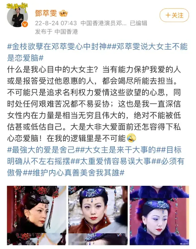 在去年《金枝欲孽》开播20年时,饰演如妃的演员邓萃雯写下对这部剧的希冀:
